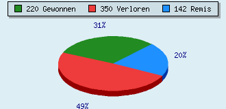 0 Partien am laufen 712 Partien beendet 220 Partien gewonnen: 16 durch Matt 155 durch Aufgabe 45 durch Zeitüberschreitung 4 durch Abbruch 350 Partien verloren: 9 durch Matt 251 durch Aufgabe 90 durch Zeitüberschreitung (= 12.6% ZÜ-Quote) 142 Partien remisiert