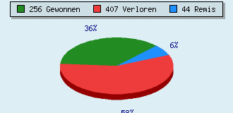 1 Partien am laufen 712 Partien beendet 260 Partien gewonnen: 59 durch Matt 162 durch Aufgabe 38 durch Zeitüberschreitung 1 durch Abbruch 408 Partien verloren: 24 durch Matt 383 durch Aufgabe 1 durch Zeitüberschreitung (= 0.1% ZÜ-Quote) 44 Partien remisiert