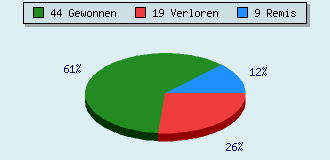 0 Partien am laufen 72 Partien beendet 44 Partien gewonnen: 4 durch Matt 36 durch Aufgabe 4 durch Zeitüberschreitung 19 Partien verloren: 0 durch Matt 18 durch Aufgabe 1 durch Zeitüberschreitung (= 1.4% ZÜ-Quote) 9 Partien remisiert