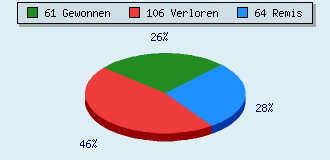 0 Partien am laufen 231 Partien beendet 61 Partien gewonnen: 4 durch Matt 46 durch Aufgabe 10 durch Zeitüberschreitung 1 durch Abbruch 106 Partien verloren: 0 durch Matt 84 durch Aufgabe 22 durch Zeitüberschreitung (= 9.5% ZÜ-Quote) 64 Partien remisiert