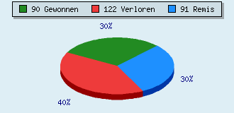 0 Partien am laufen 303 Partien beendet 90 Partien gewonnen: 8 durch Matt 67 durch Aufgabe 15 durch Zeitüberschreitung 122 Partien verloren: 0 durch Matt 108 durch Aufgabe 13 durch Zeitüberschreitung (= 4.3% ZÜ-Quote) 1 durch Abbruch 91 Partien remisiert