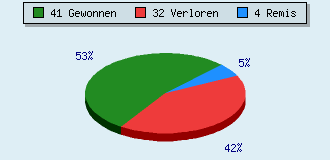 1 Partien am laufen 77 Partien beendet 41 Partien gewonnen: 5 durch Matt 30 durch Aufgabe 6 durch Zeitüberschreitung 32 Partien verloren: 0 durch Matt 24 durch Aufgabe 8 durch Zeitüberschreitung (= 10.4% ZÜ-Quote) 4 Partien remisiert