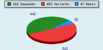 9 Partien am laufen 948 Partien beendet 418 Partien gewonnen: 139 durch Matt 243 durch Aufgabe 36 durch Zeitüberschreitung 483 Partien verloren: 221 durch Matt 262 durch Aufgabe 0 durch Zeitüberschreitung (= 0% ZÜ-Quote) 47 Partien remisiert