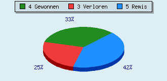 0 Partien am laufen 12 Partien beendet 4 Partien gewonnen: 0 durch Matt 2 durch Aufgabe 2 durch Zeitüberschreitung 3 Partien verloren: 0 durch Matt 2 durch Aufgabe 1 durch Zeitüberschreitung (= 8.3% ZÜ-Quote) 5 Partien remisiert