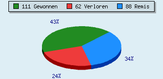 0 Partien am laufen 261 Partien beendet 111 Partien gewonnen: 6 durch Matt 92 durch Aufgabe 13 durch Zeitüberschreitung 62 Partien verloren: 0 durch Matt 57 durch Aufgabe 5 durch Zeitüberschreitung (= 1.9% ZÜ-Quote) 88 Partien remisiert