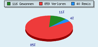 1 Partien am laufen 1015 Partien beendet 116 Partien gewonnen: 22 durch Matt 72 durch Aufgabe 22 durch Zeitüberschreitung 859 Partien verloren: 65 durch Matt 628 durch Aufgabe 166 durch Zeitüberschreitung (= 16.4% ZÜ-Quote) 40 Partien remisiert