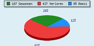 0 Partien am laufen 709 Partien beendet 187 Partien gewonnen: 22 durch Matt 122 durch Aufgabe 42 durch Zeitüberschreitung 1 durch Abbruch 437 Partien verloren: 88 durch Matt 342 durch Aufgabe 7 durch Zeitüberschreitung (= 1% ZÜ-Quote) 85 Partien remisiert