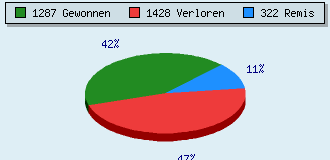 0 Partien am laufen 3037 Partien beendet 1287 Partien gewonnen: 272 durch Matt 870 durch Aufgabe 144 durch Zeitüberschreitung 1 durch Abbruch 1428 Partien verloren: 72 durch Matt 1340 durch Aufgabe 16 durch Zeitüberschreitung (= 0.5% ZÜ-Quote) 322 Partien remisiert