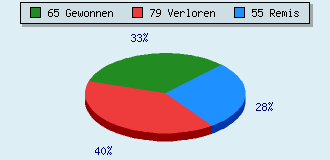 0 Partien am laufen 199 Partien beendet 65 Partien gewonnen: 2 durch Matt 50 durch Aufgabe 12 durch Zeitüberschreitung 1 durch Abbruch 79 Partien verloren: 4 durch Matt 74 durch Aufgabe 1 durch Zeitüberschreitung (= 0.5% ZÜ-Quote) 55 Partien remisiert