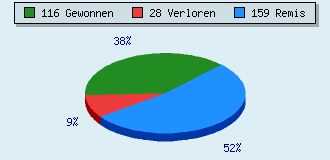 0 Partien am laufen 303 Partien beendet 116 Partien gewonnen: 5 durch Matt 99 durch Aufgabe 11 durch Zeitüberschreitung 1 durch Abbruch 28 Partien verloren: 0 durch Matt 28 durch Aufgabe 0 durch Zeitüberschreitung (= 0% ZÜ-Quote) 159 Partien remisiert