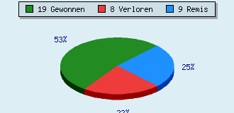 0 Partien am laufen 36 Partien beendet 19 Partien gewonnen: 4 durch Matt 12 durch Aufgabe 3 durch Zeitüberschreitung 8 Partien verloren: 0 durch Matt 8 durch Aufgabe 0 durch Zeitüberschreitung (= 0% ZÜ-Quote) 9 Partien remisiert
