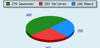 9 Partien am laufen 578 Partien beendet 279 Partien gewonnen: 23 durch Matt 169 durch Aufgabe 83 durch Zeitüberschreitung 4 durch Abbruch 153 Partien verloren: 0 durch Matt 148 durch Aufgabe 5 durch Zeitüberschreitung (= 0.9% ZÜ-Quote) 146 Partien remisiert