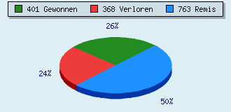 33 Partien am laufen 1532 Partien beendet 401 Partien gewonnen: 37 durch Matt 276 durch Aufgabe 88 durch Zeitüberschreitung 368 Partien verloren: 0 durch Matt 354 durch Aufgabe 14 durch Zeitüberschreitung (= 0.9% ZÜ-Quote) 763 Partien remisiert