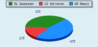 0 Partien am laufen 139 Partien beendet 51 Partien gewonnen: 5 durch Matt 41 durch Aufgabe 5 durch Zeitüberschreitung 23 Partien verloren: 0 durch Matt 22 durch Aufgabe 1 durch Zeitüberschreitung (= 0.7% ZÜ-Quote) 65 Partien remisiert